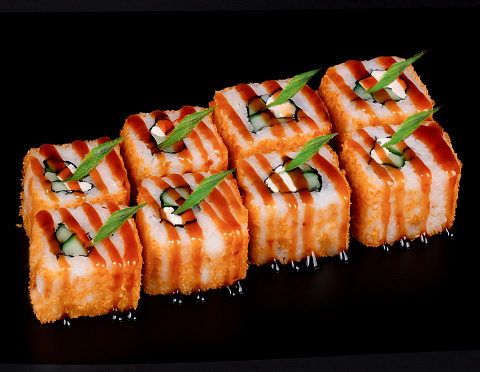 Омлет, огурец, рис, нори, соус инари, лук фри, лук зеленый